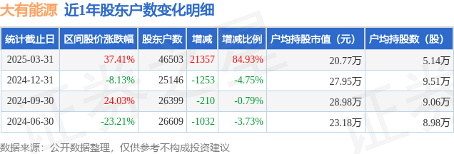 从股价来看,2024年12月31日至2025年3月31日,大有能源区间涨幅为37.41%,在此期间股东户数增加2.14万户,增幅为84.93%。